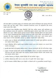 मंगलबार सूचना जारी गर्दै महासंघले सुनचाँदी किनबेच गर्दा ग्राहकको प्रमाणिक परिचयपत्र र आवश्यक कागजात जाँच गरेर मात्र कारोबार गर्न भनिएको छ । कुनै पनि शंकास्पद गतिविधि देखिएमा तुरुन्त नजिकैको प्रहरी वा सुरक्षाकर्मीलाई जानकारी गराउन समेत महासंघले आग्रह गरेको छ ।