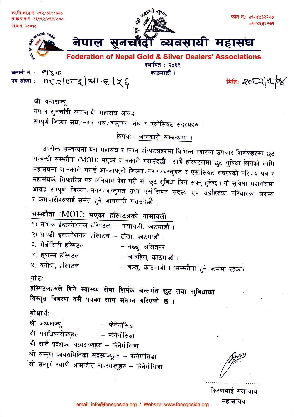 सुनचाँदी व्यवसायी महासंघमा आवद्ध व्यवसायी तथा कर्मचारीहरुले अब स्वास्थ्य उपचारमा विशेष छुट पाउने